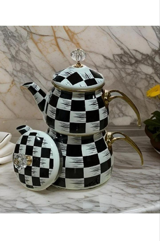 ست کتری قوری لعابی ترکیه ای مشکی شطرنجی (unigoods.ir)